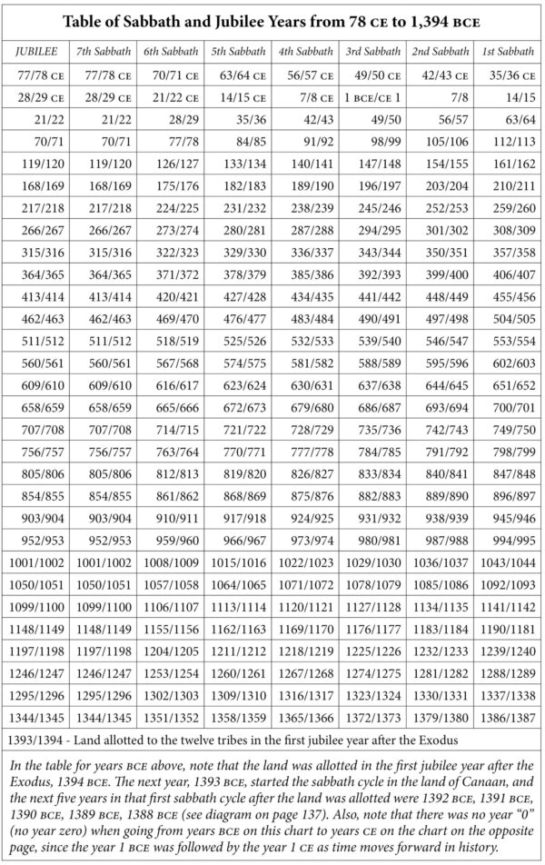 The Romans destroyed Herod’s Temple in 70 CE, which the ancient Jewish book of chronology, the Seder Olam, records as an event that occurred in a Sabbath Year. Counting backwards in time in seven-year increments from 70 CE reveals the following chronology for the year of the Exodus and the years for the first Sabbath and Jubilee years celebrated by the Israelites after they entered the Promised Land. See Table of Sabbath and Jubilee Years.